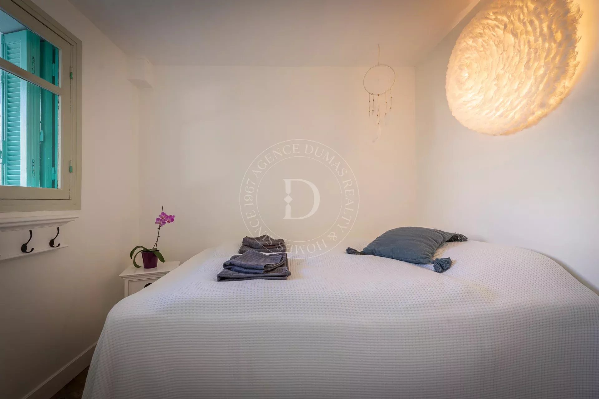Nice living room with a fully equipped American kitchen, a bedroom with a double bed and sea view, another bedroom at the back with a double bed, shower room with toilet.