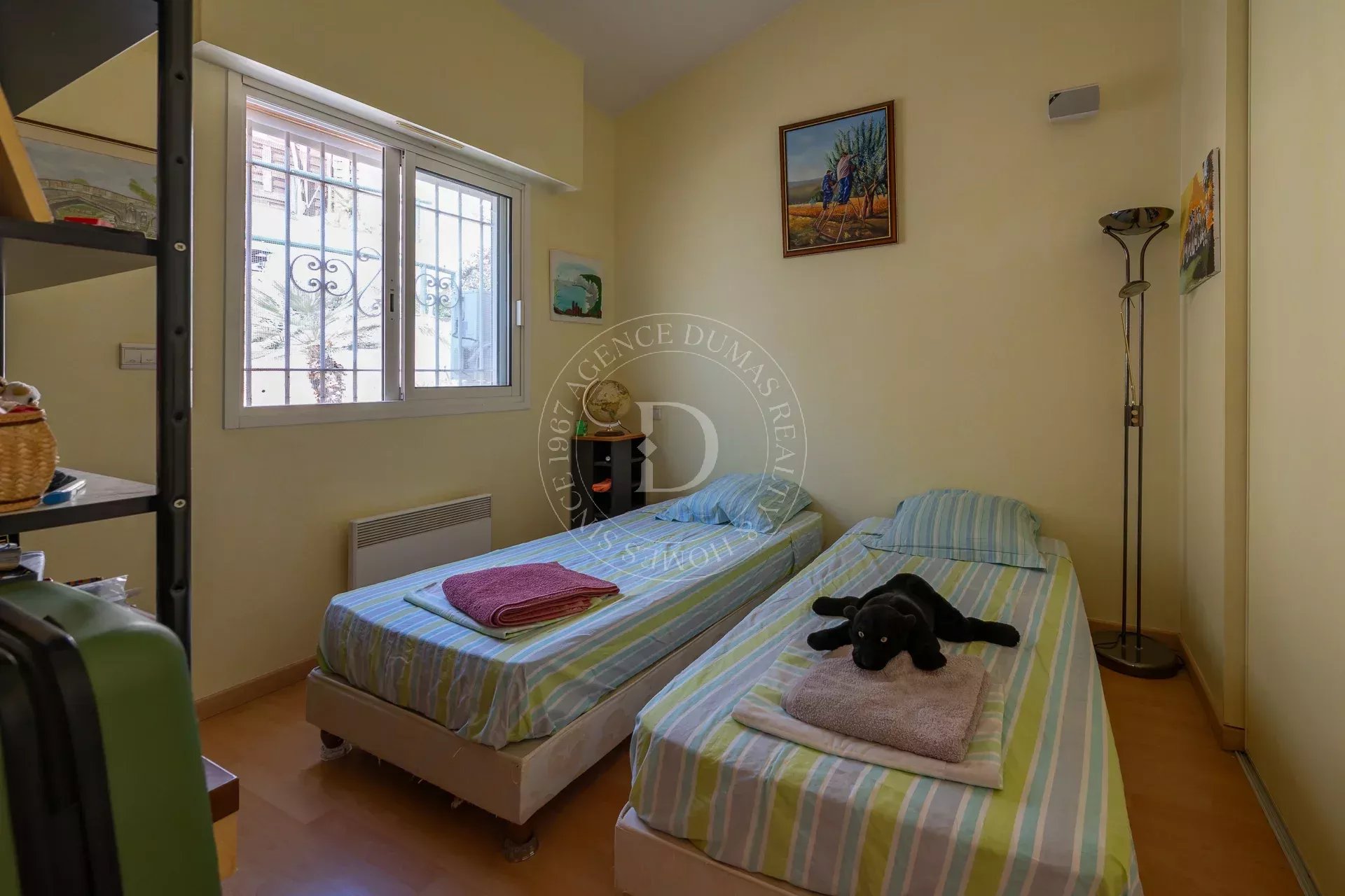 Con una superficie abitabile confortevole, è composto da tre locali, tra cui un ampio e luminoso soggiorno che si apre su una terrazza eccezionale di 70 m², ideale per godersi il sole mediterraneo in ogni stagione. La zona notte offre due camere da letto, ciascuna con il proprio bagno.