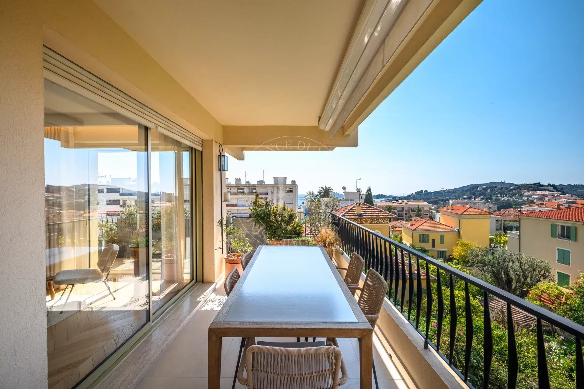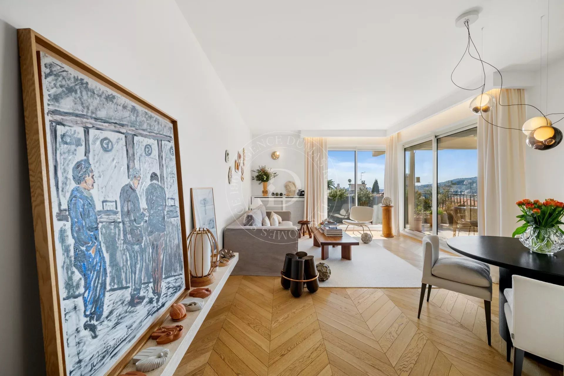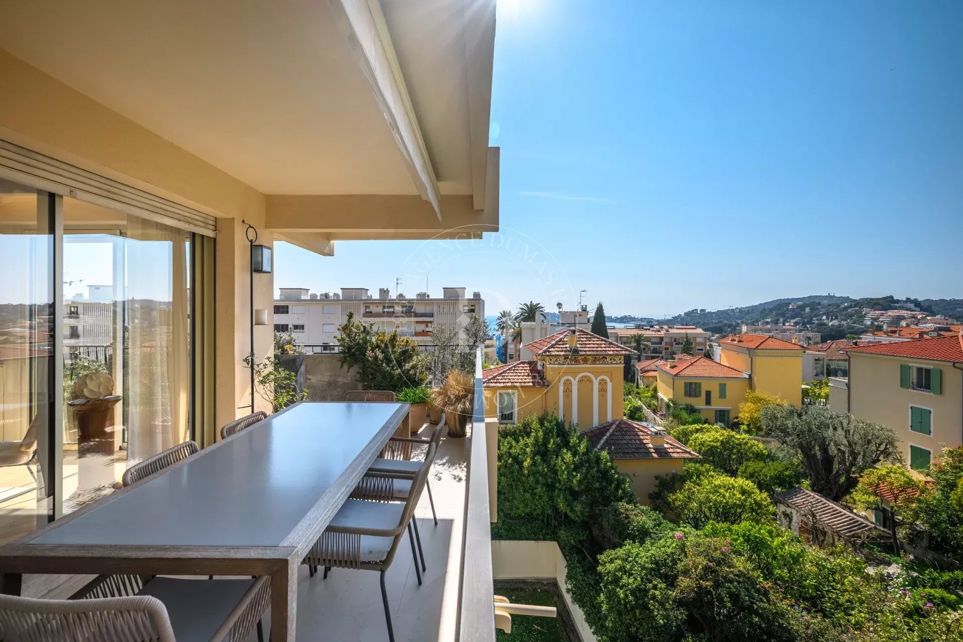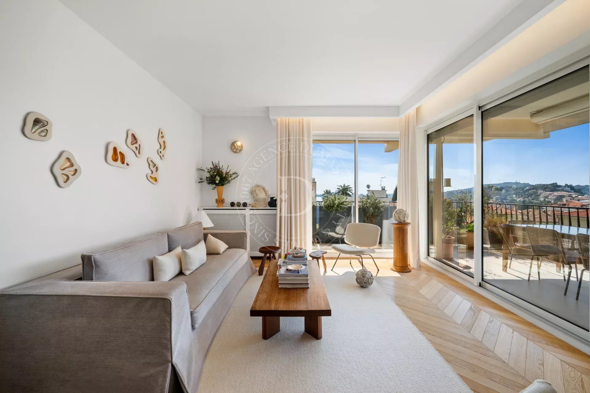 Le séjour s’ouvre sur une terrasse d’environ 21 m², offrant une vue dégagée avec aperçu mer, entre écrin de verdure et horizon azuré, propice à la contemplation.