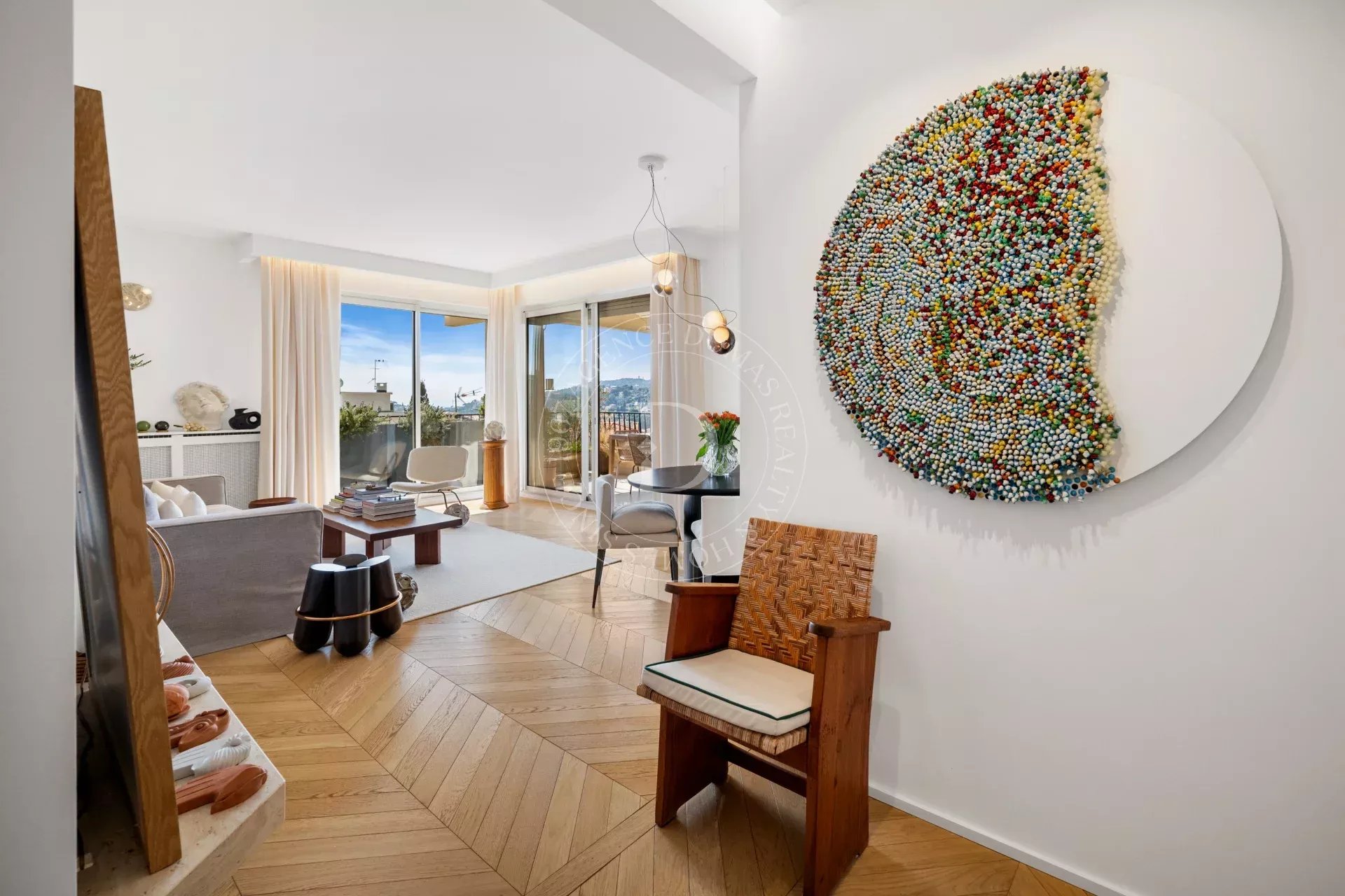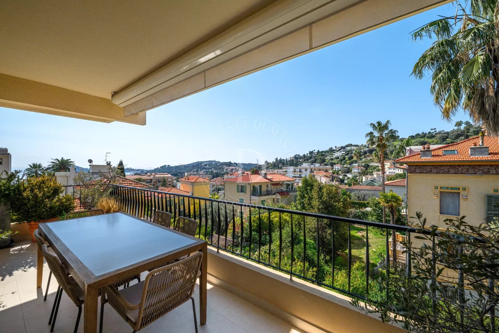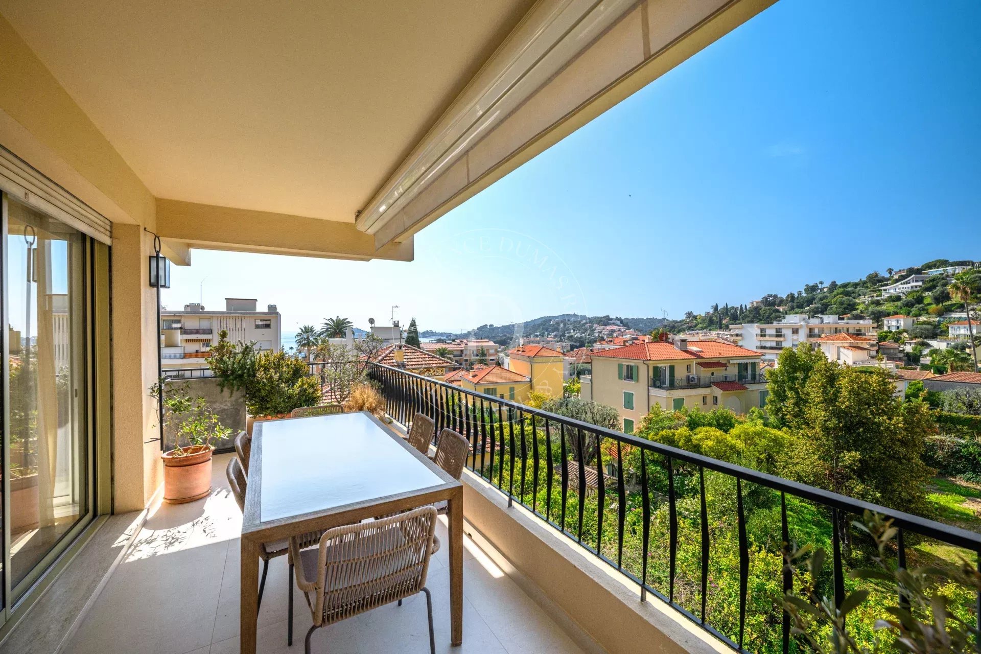 Le séjour s’ouvre sur une terrasse d’environ 21 m², offrant une vue dégagée avec aperçu mer, entre écrin de verdure et horizon azuré, propice à la contemplation.