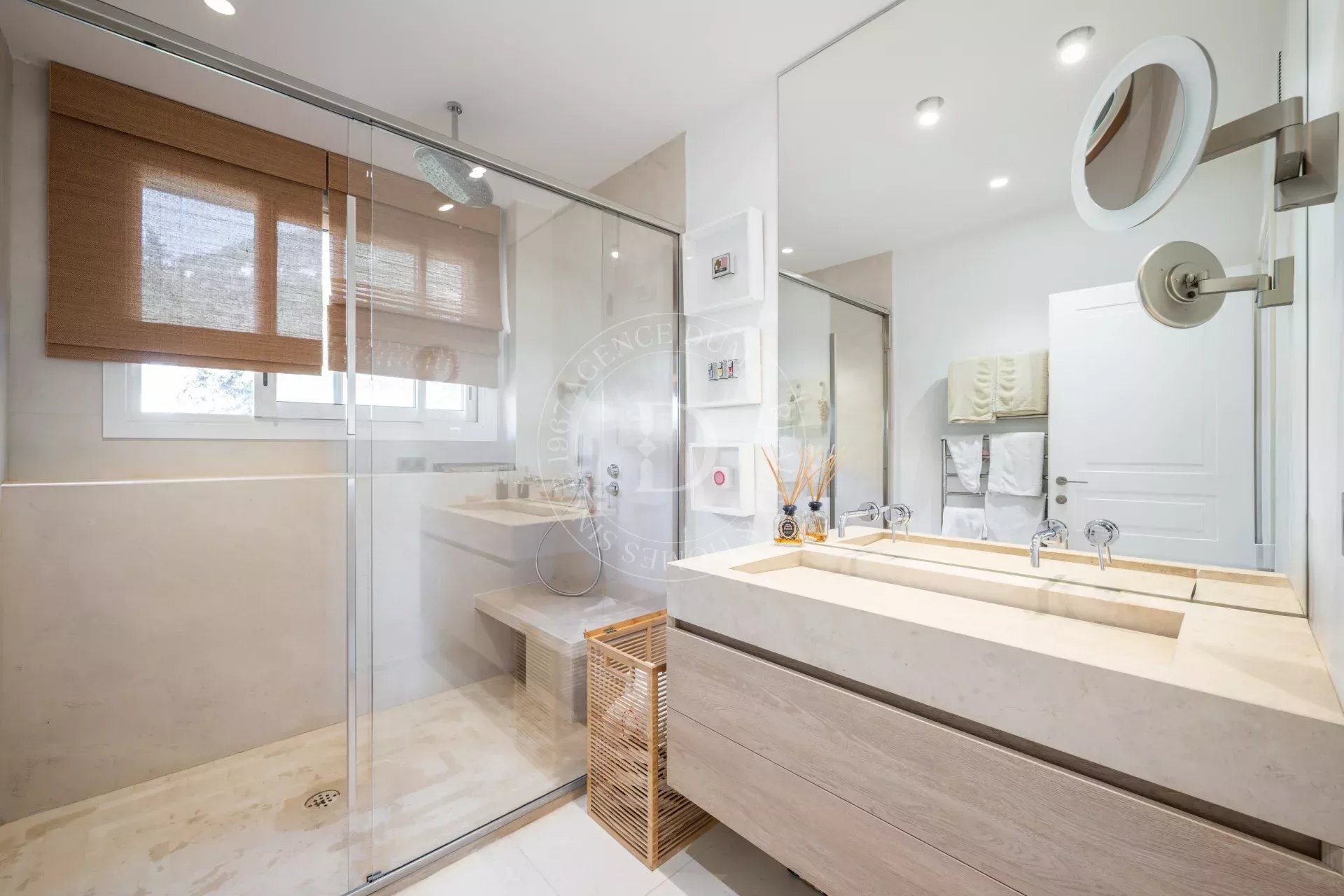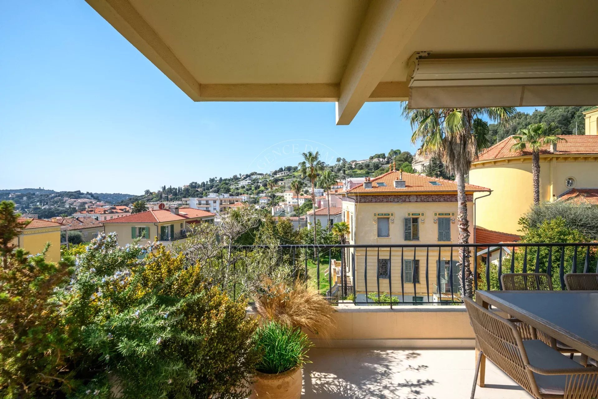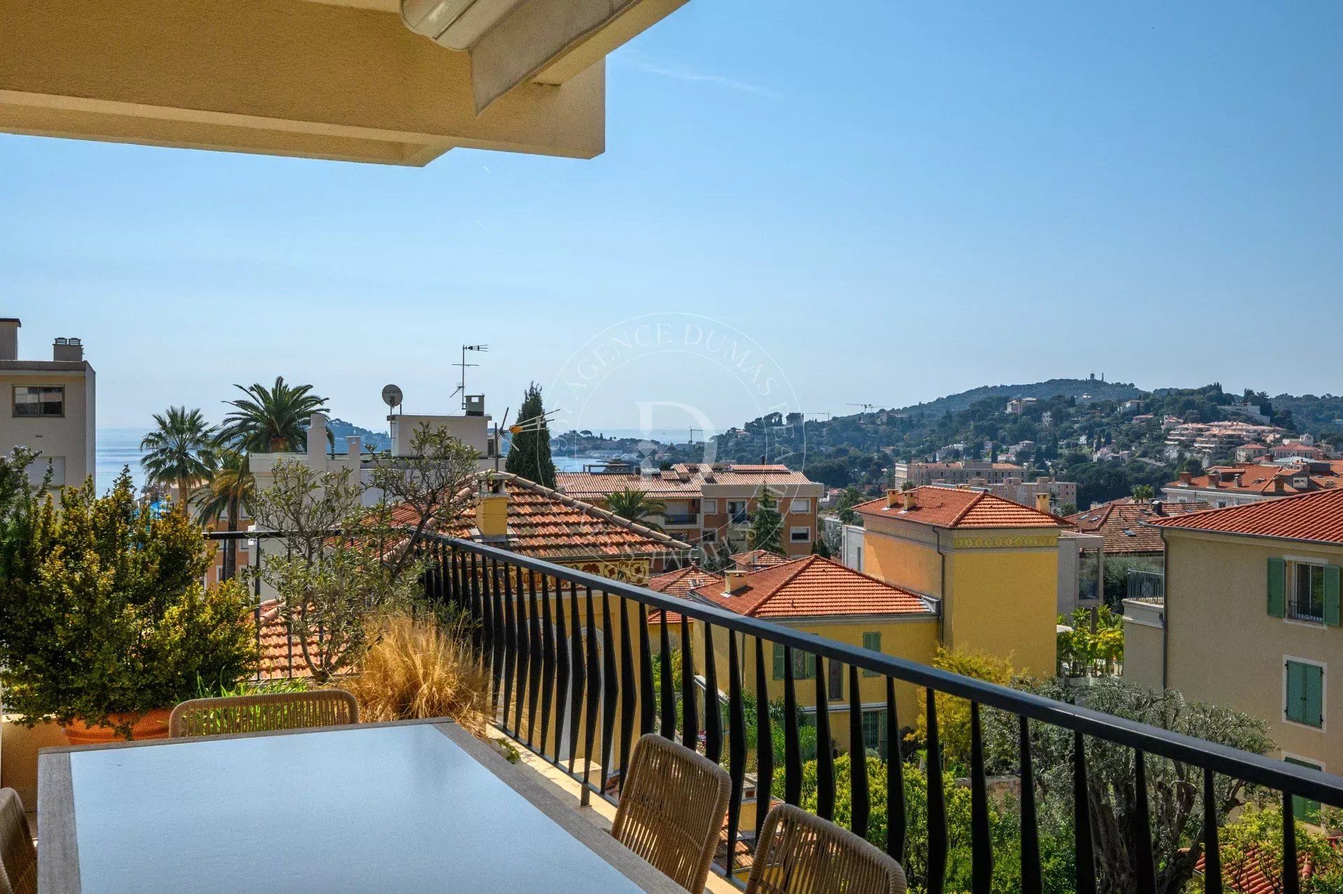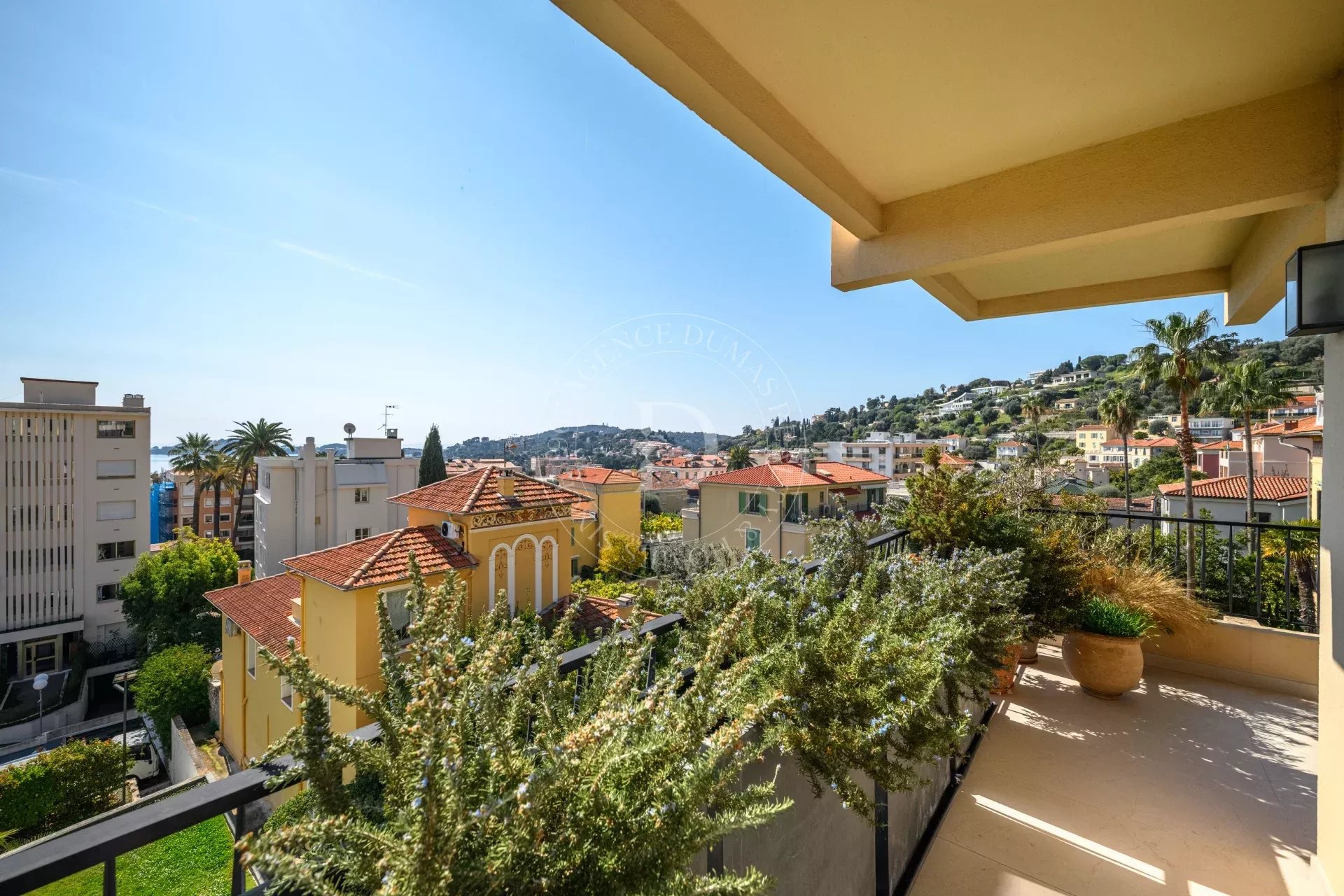 Le séjour s’ouvre sur une terrasse d’environ 21 m², offrant une vue dégagée avec aperçu mer, entre écrin de verdure et horizon azuré, propice à la contemplation.