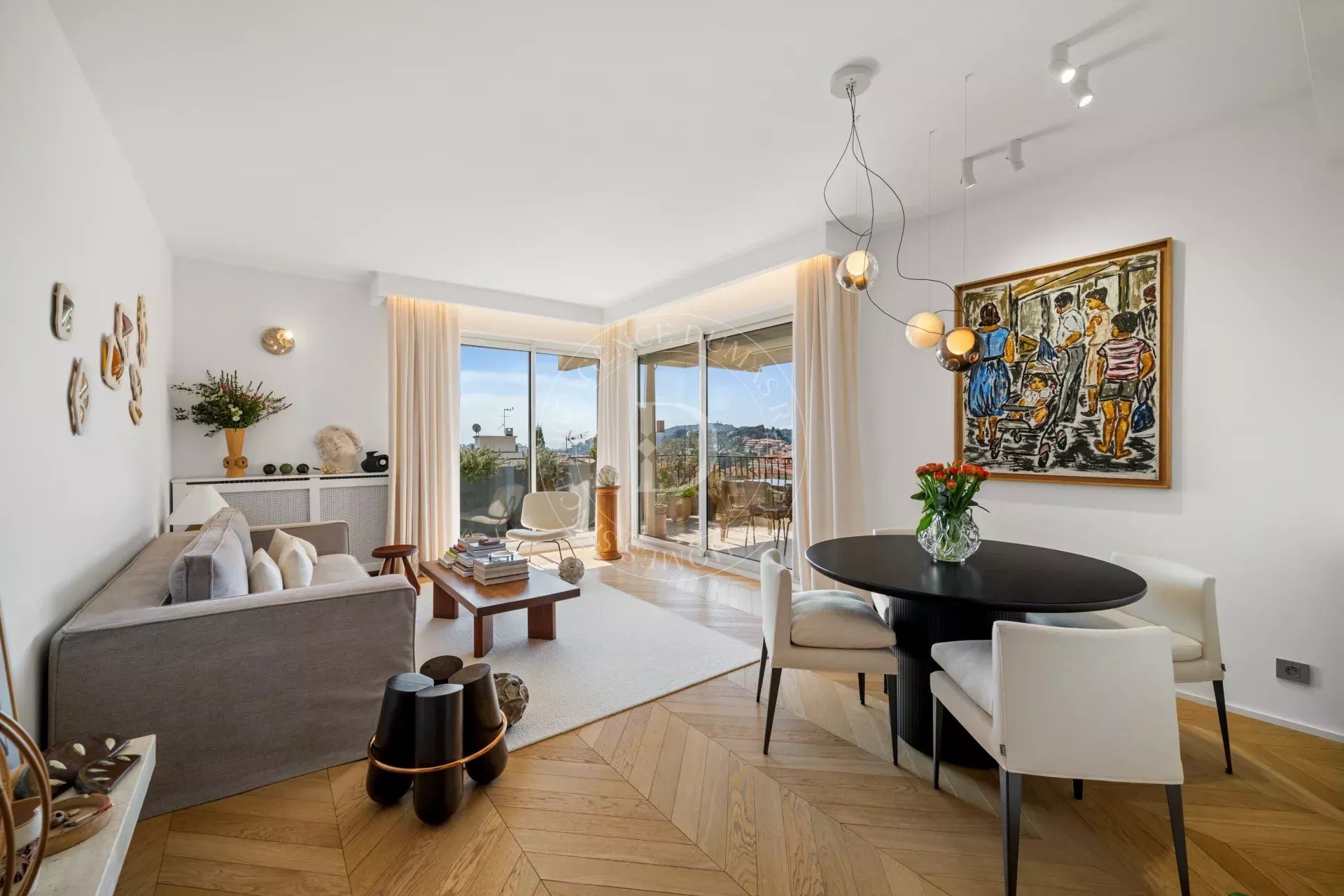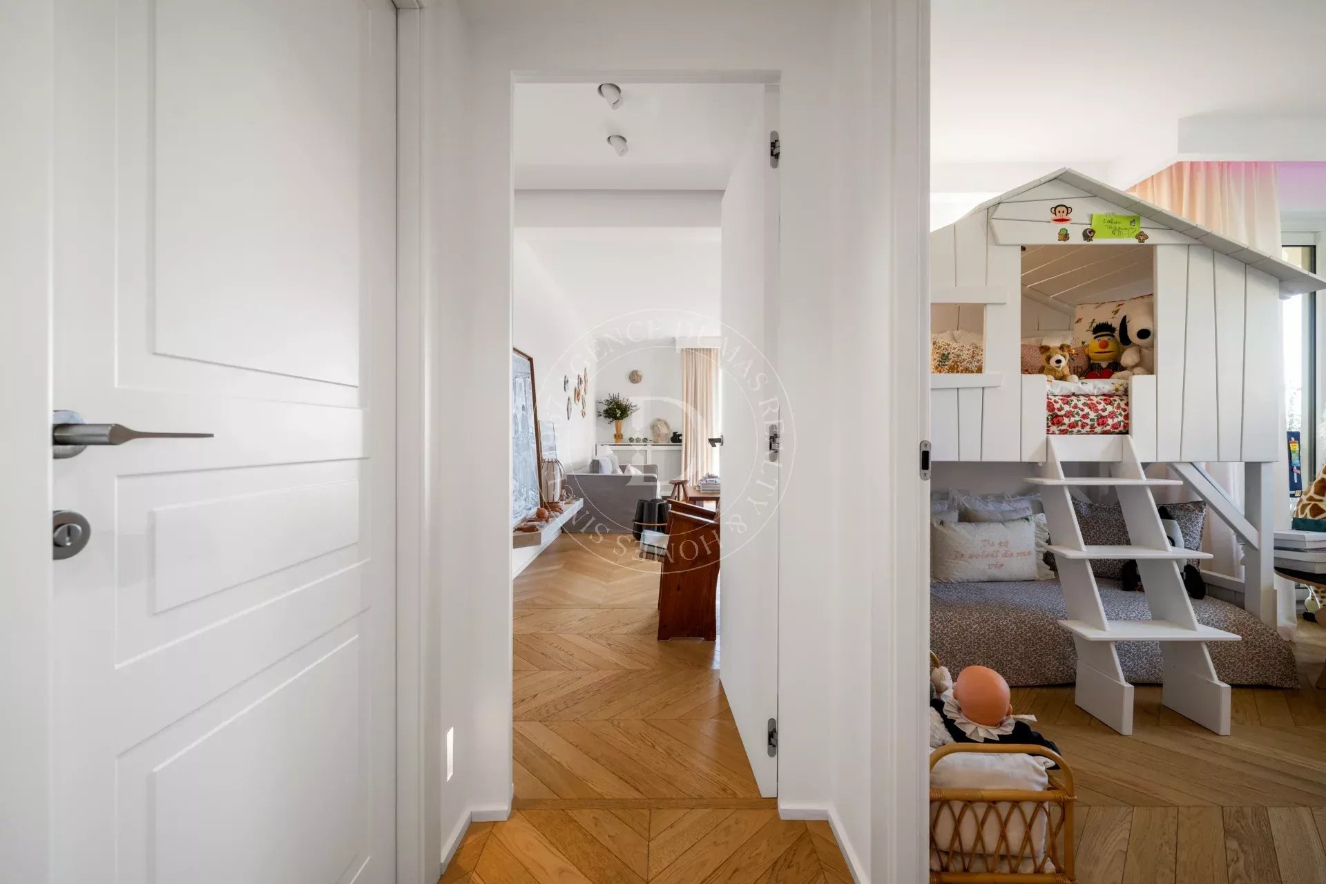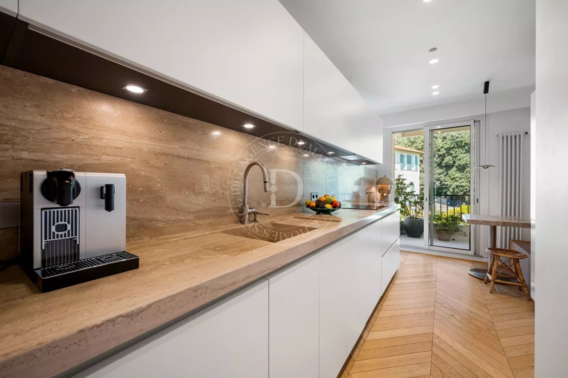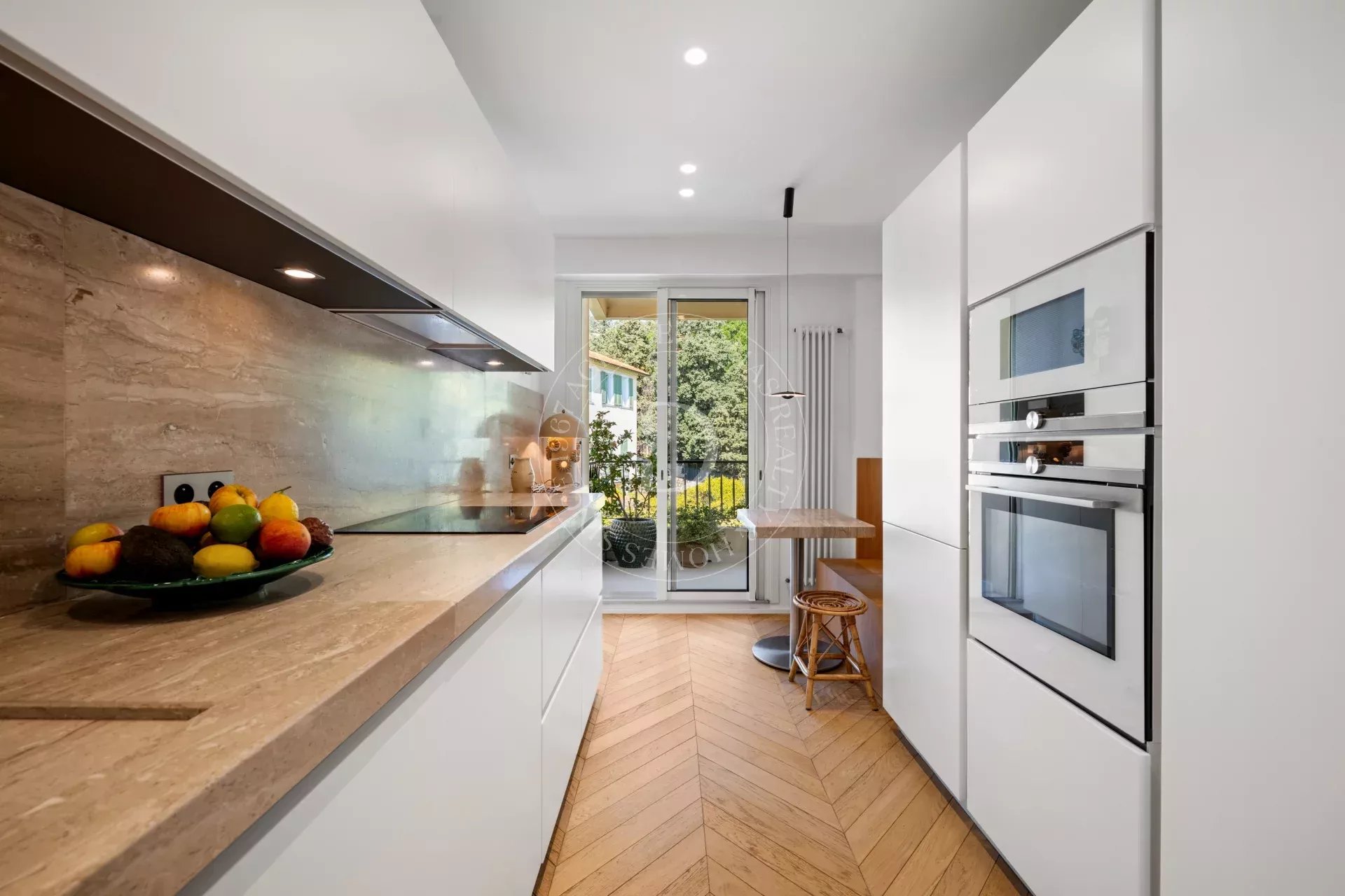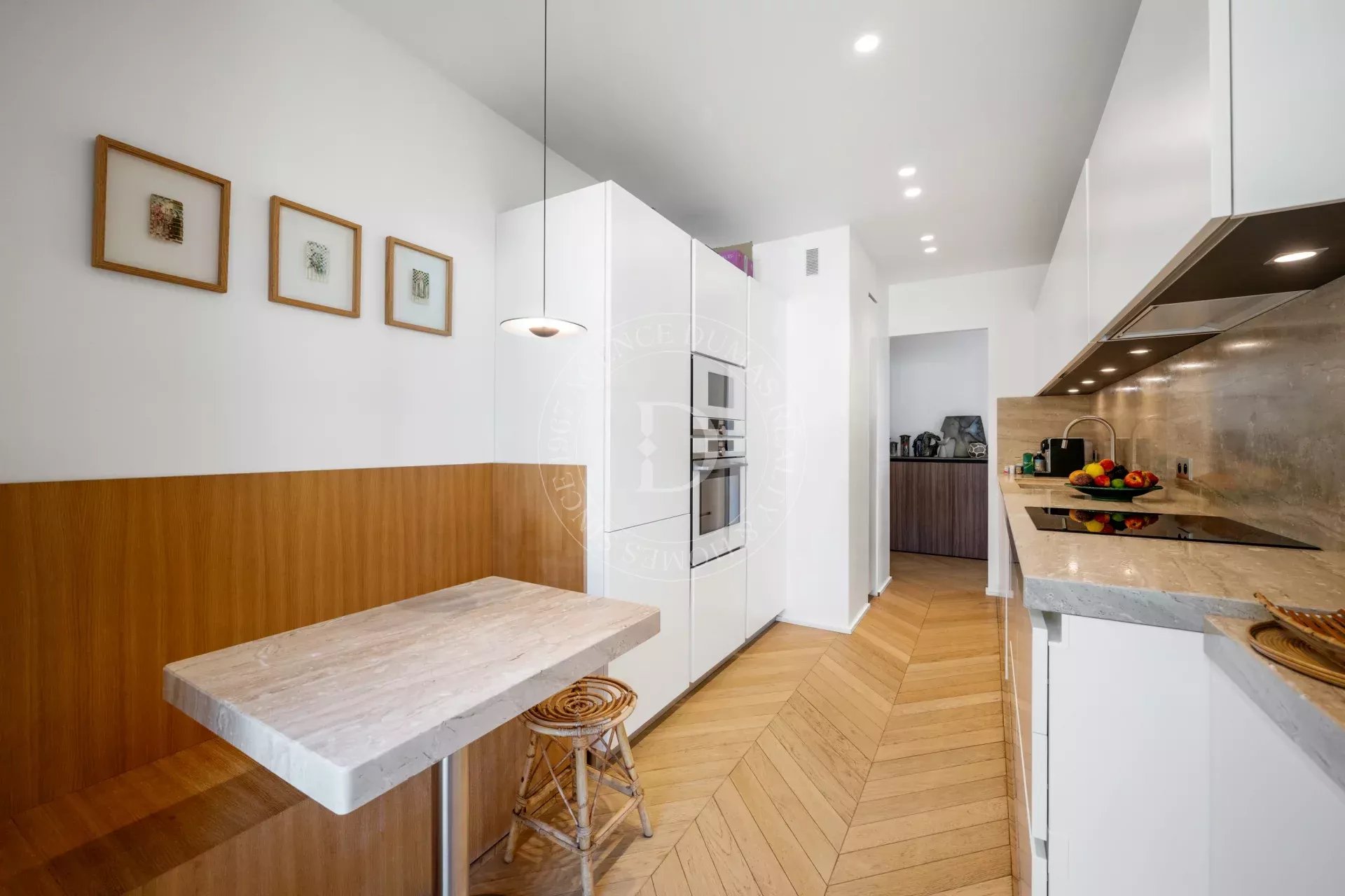 Rénové avec une exigence remarquable, l’appartement révèle un sens du détail subtil : parquet point de Hongrie, lignes épurées, harmonie des matières et des teintes.