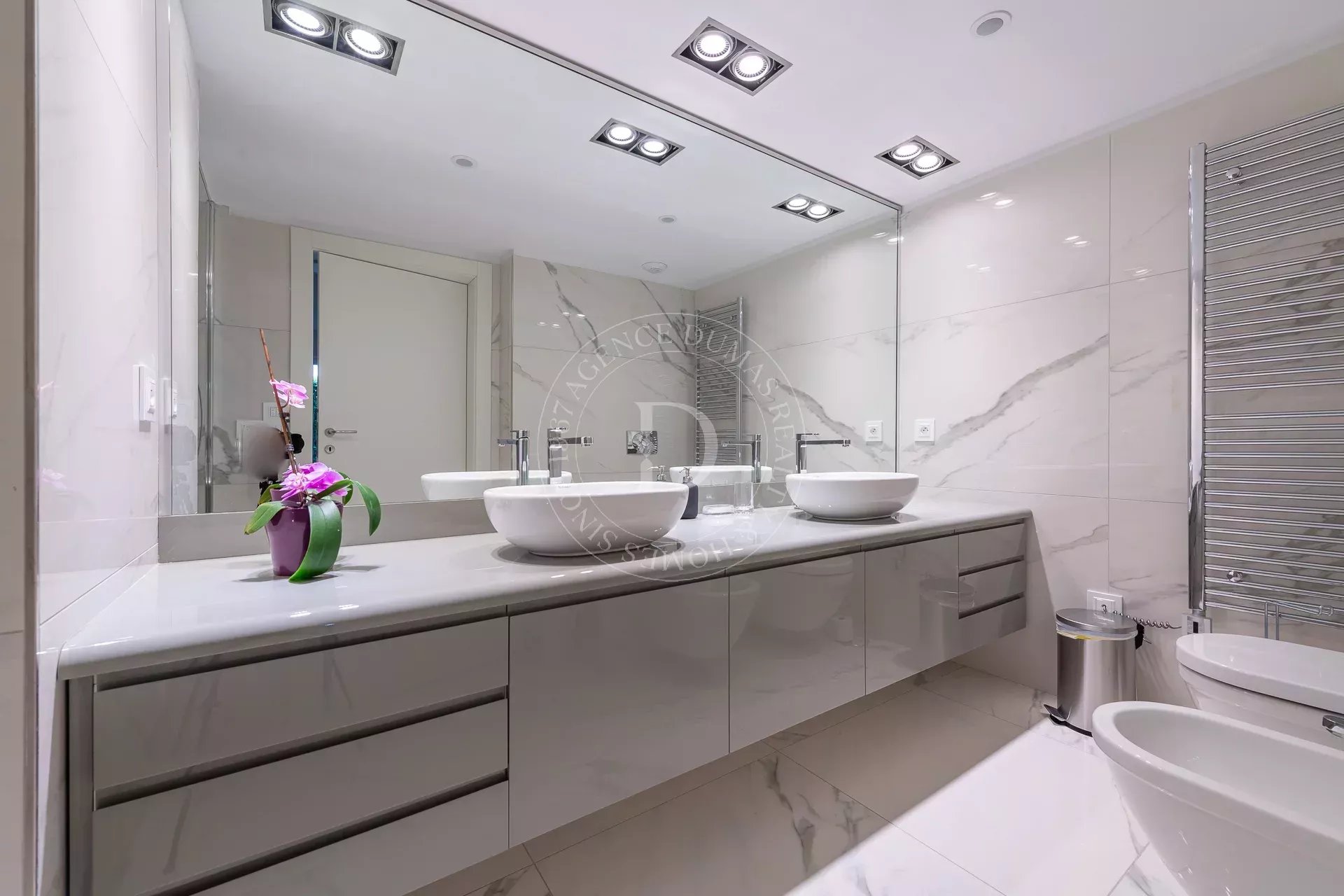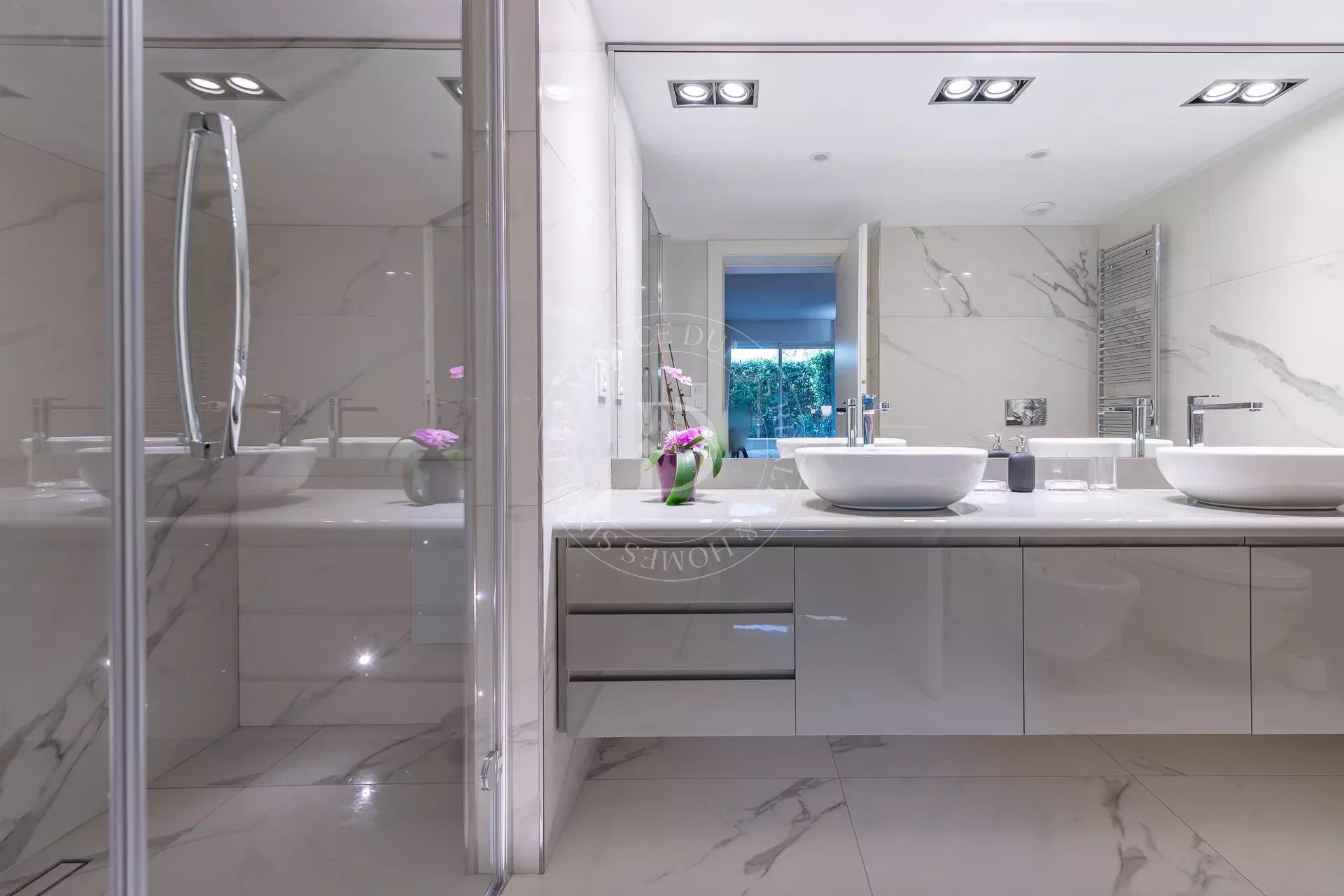 – Ample séjour d’environ 73m2 avec cuisine ouverte complètement équipe. L’ensemble traité en marbre blanc et ouvrant sur une grande terrasse et un jardin privatif