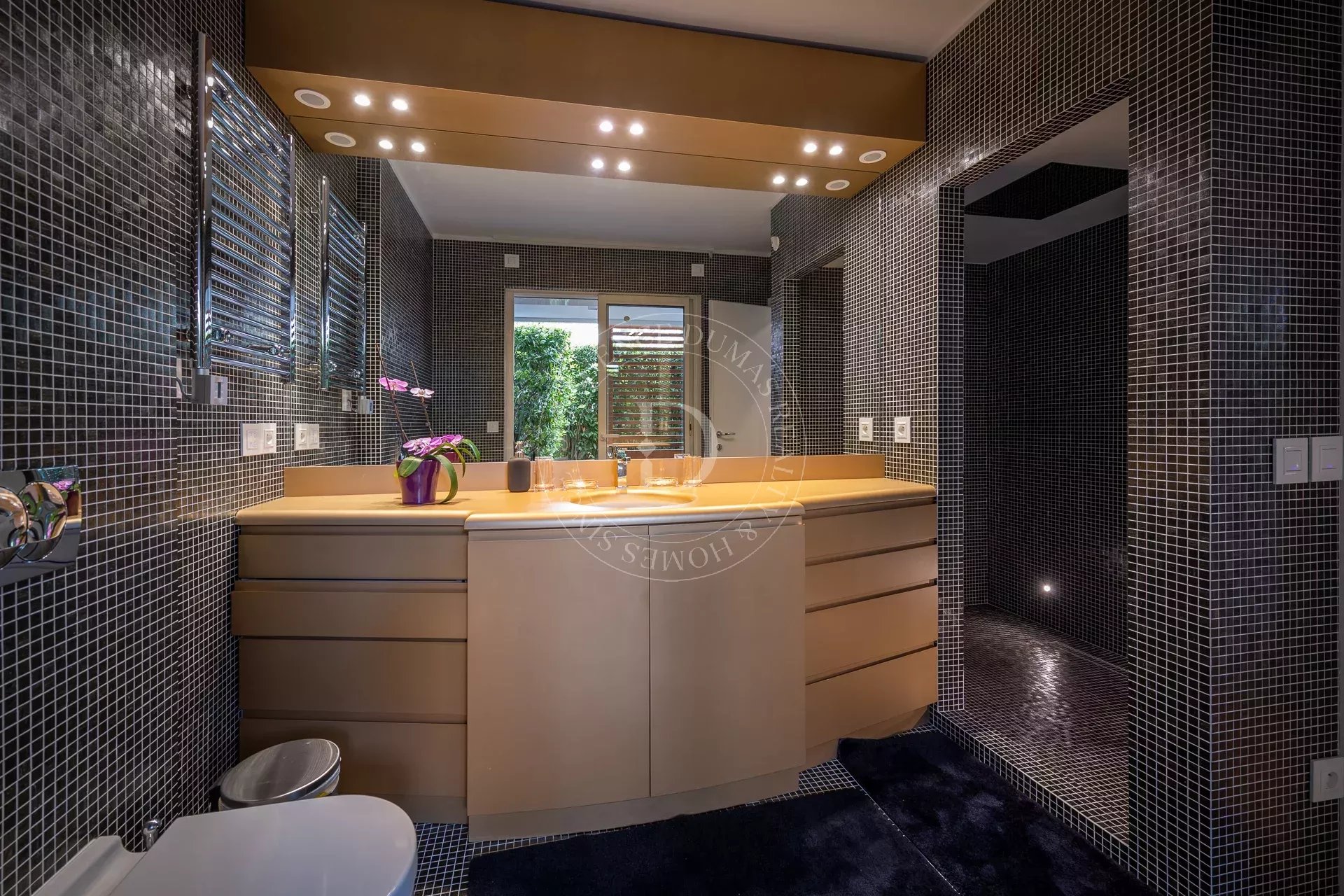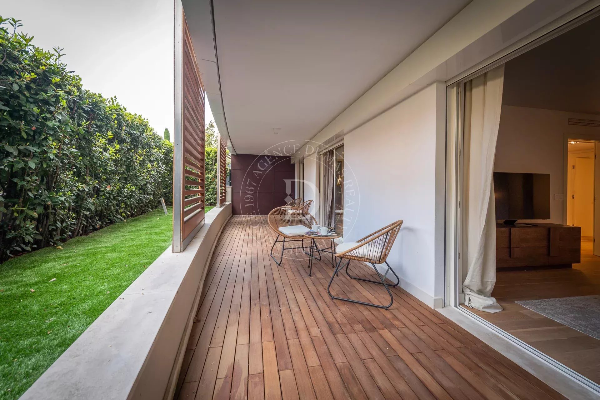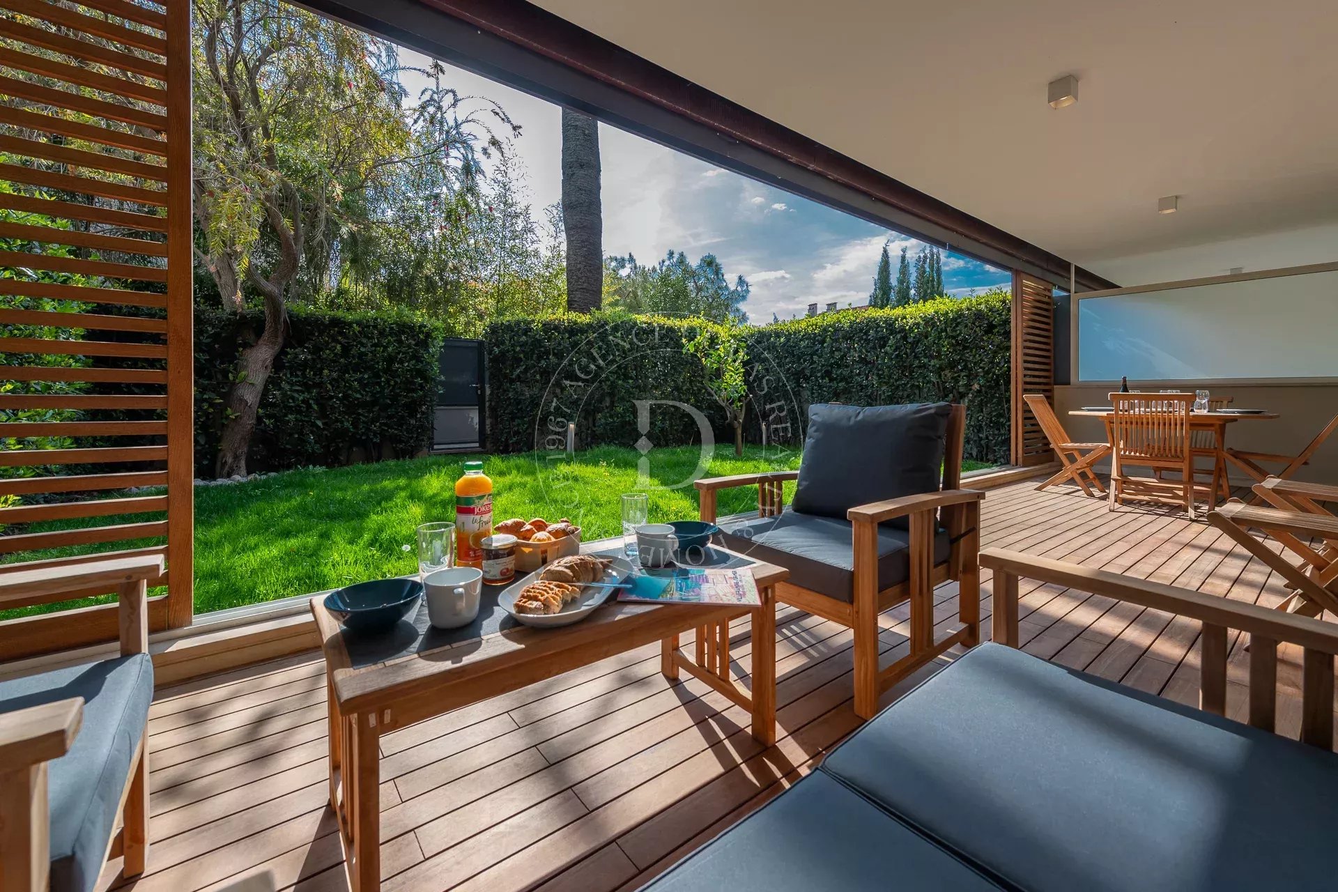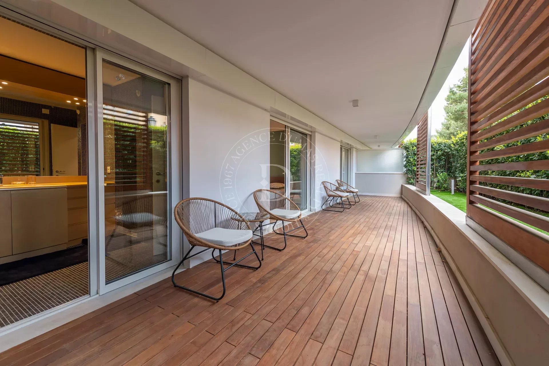 – Deux magnifiques terrasses avec brises soleil en bois exotique Iroko et suivies des espaces verts viennent agrandir les pièces à vivre.