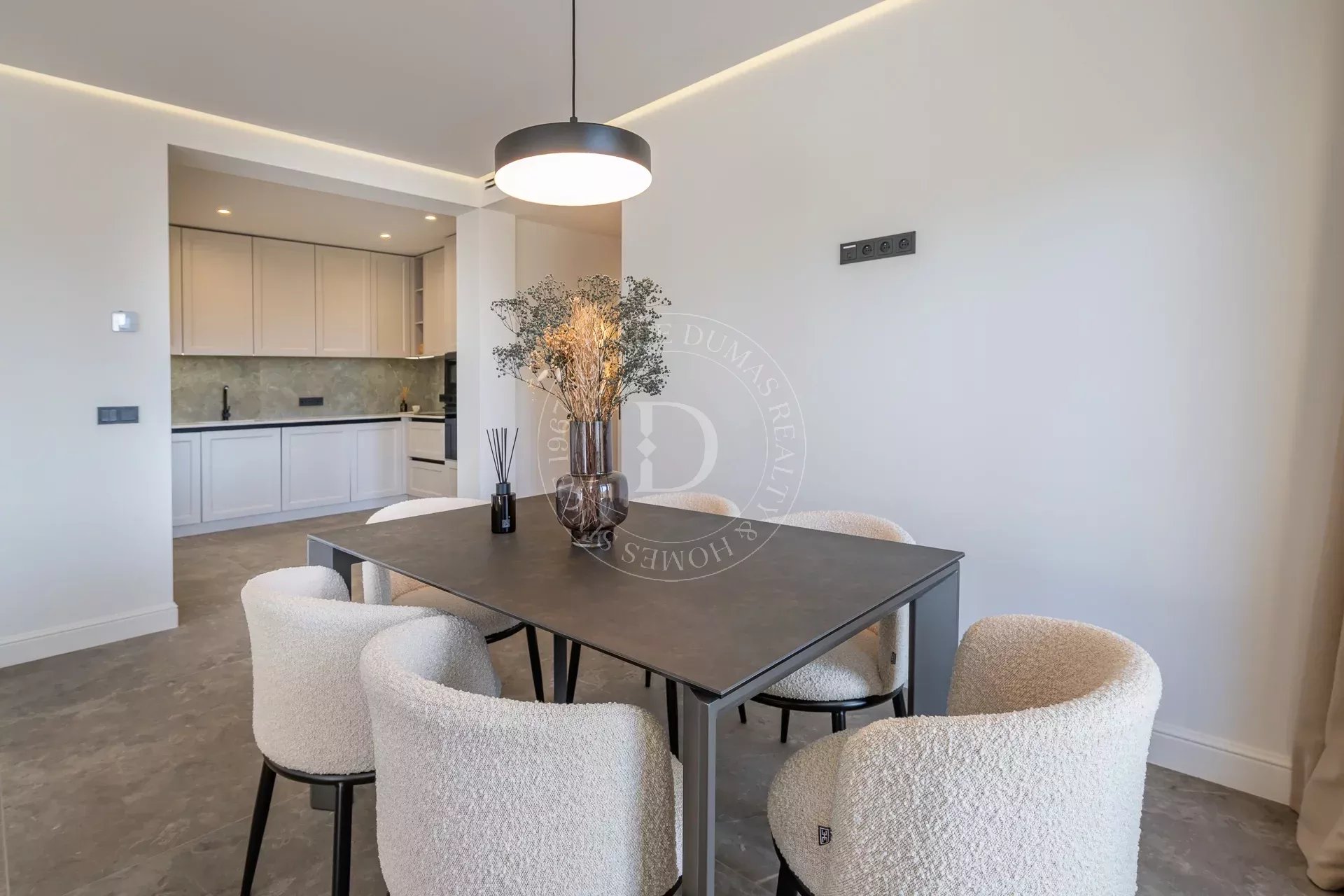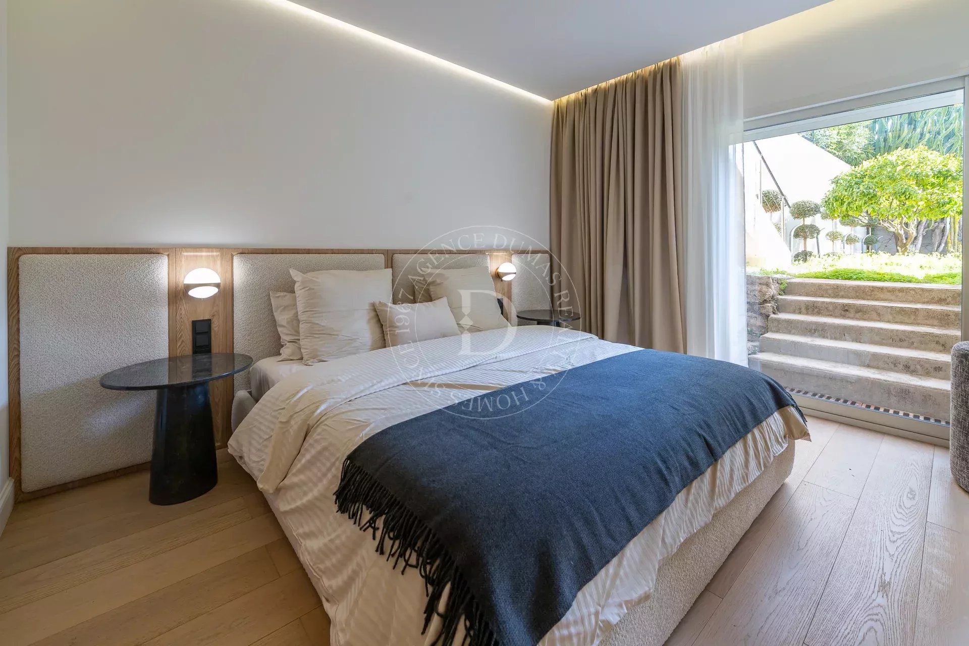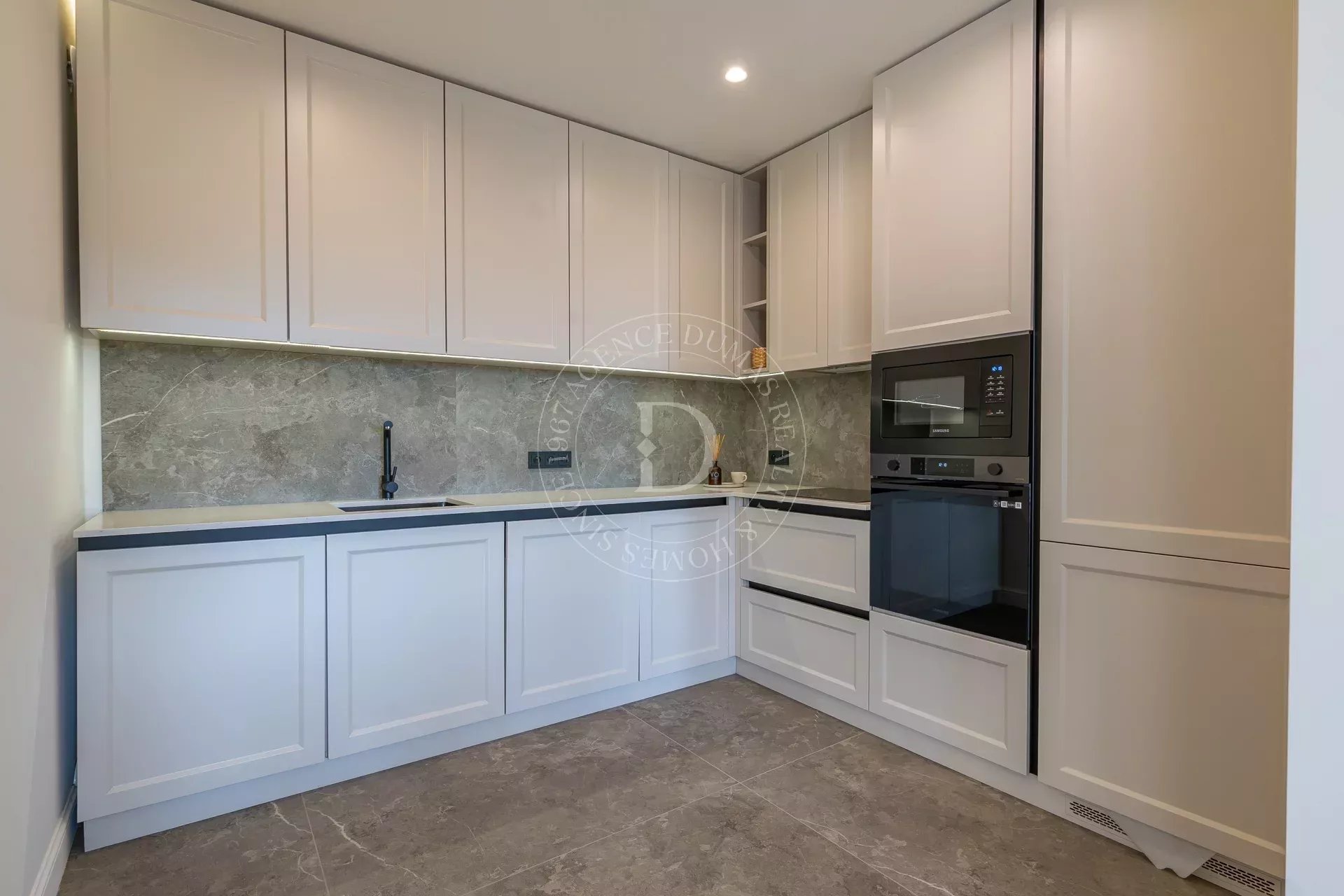 С первых шагов вас очарует светлая гостиная, открывающаяся на просторную солнечную террасу-сад площадью около 100 м² – настоящий оазис спокойствия с потрясающим видом на море. Полностью оборудованная кухня сочетает стиль и функциональность для максимального комфорта.